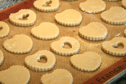 Roll the dough 1/4-inch thick and cut 2 3/4-inch rounds with a plain or fluted cutter. With 1/2 of the rounds, cut a hole from the middle of each round with a heart or spade shaped cutter. Place all the cookies on an ungreased baking sheet and chill for 15 minutes.