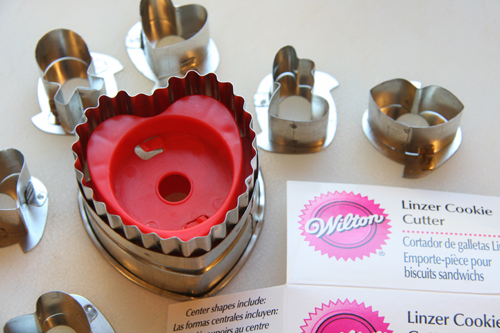 As icing on the cake or perhaps more like powdered sugar on the cookies, they got to use the coolest cookie cutter EVER.  Really. It’s from Wilton and I picked it up from our local Michael’s craft store for $4.99.  It cuts beautiful mini Linzer cookies AND has a choice of six differently shaped centers to cut out.  The girls would twist on and off the little centers of the cookie cutters and choose the design of their liking.  What fun for kids and adults alike!