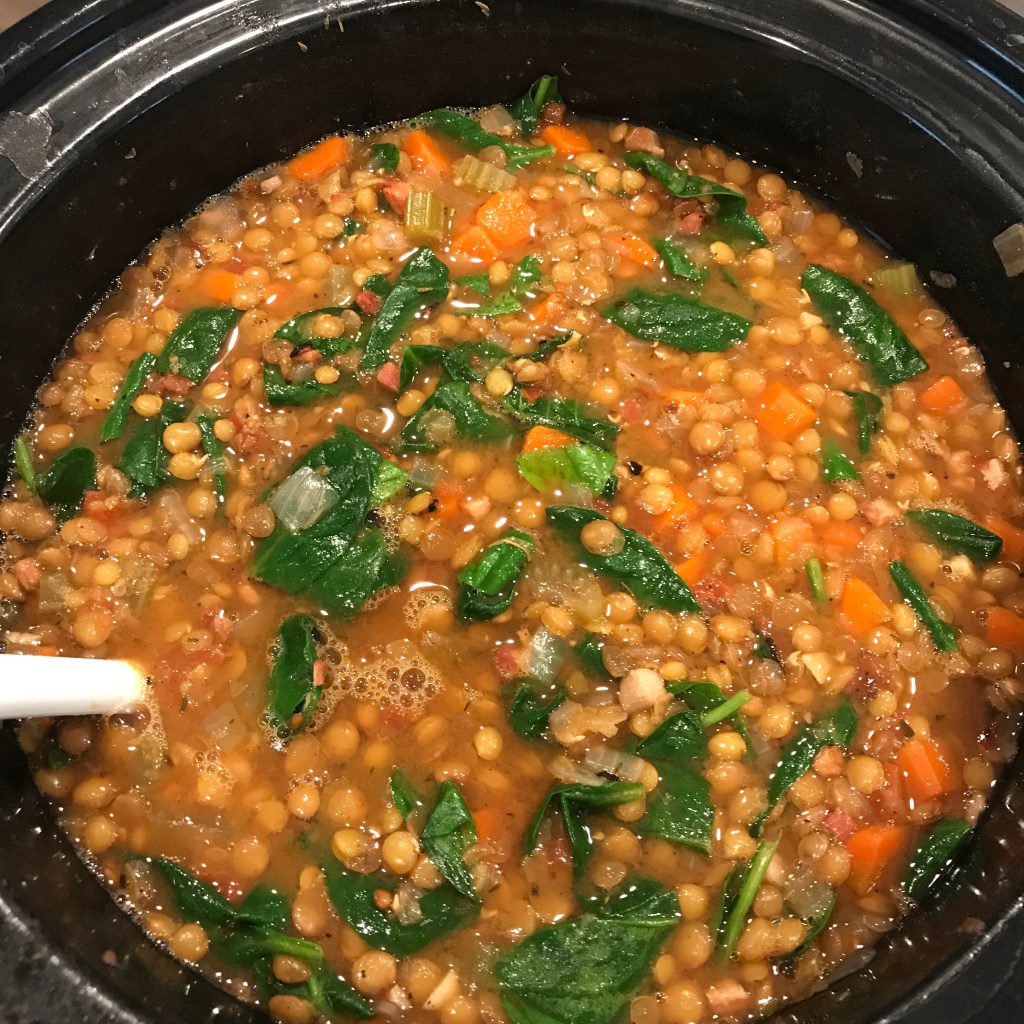 This Green Lentil soup is cozy, earthy and brimming with smokiness from the Pancetta and cumin. If you cook it just right, then a spoonful is a bit toothsome, and the lentils are not quite falling apart. Oh, and there’s just a hint of heat from the fire roasted tomatoes and plenty of good for you ingredients like spinach and carrots. A bowl of this is like a warm but slightly spicy hug. All good things in other words.